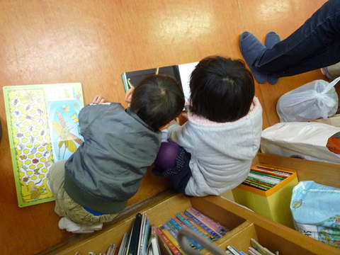 本棚から本を取り出しては声出して読みます。おいおいおい、みんな製作中ですよ。。