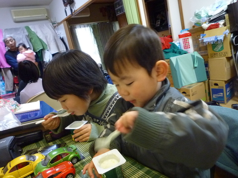 おじいちゃんにチョコを届けにきたはずが、すっかりごちそうになる2人。