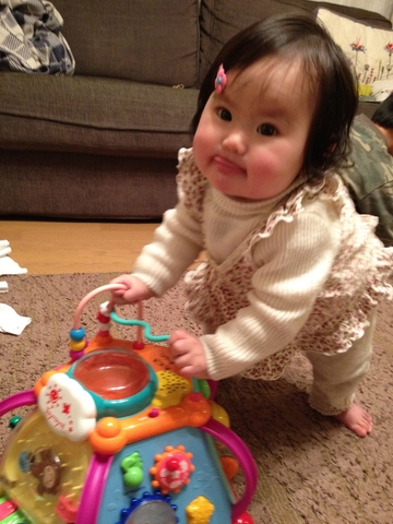 おもちゃにつかまって立ったと思ったら、ぐいぐい押しながら歩き始めた!