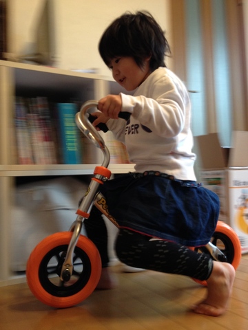 だいぶ遅ればせながら、新の誕生日プレゼントに足こぎ自転車を購入。そしてもちろん試乗は兄姉さん方が。