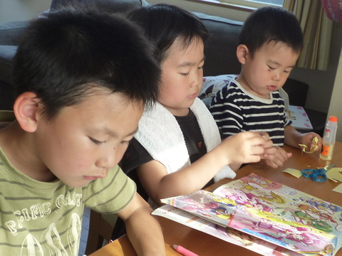 手前、宿題中の1年生。奥の2人は雑誌の付録作り。繊細な仕事中のはずが、お姉さんガテン系に見えるのはタオルのせいかw