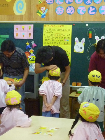 父の日参観恒例の、お父さんへ父の日のプレゼントを手渡し。「お父さん大好き♪」って言いながら渡したそうですよ。