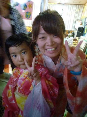 踊りが終わって、今日のお土産をもらって解散。大好きな先生と記念にパチリ☆