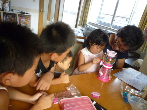 ネックレスを作るのに90個(だっけ?)のビーズをつなぐんだそうで、横の外野は数を数え中です。