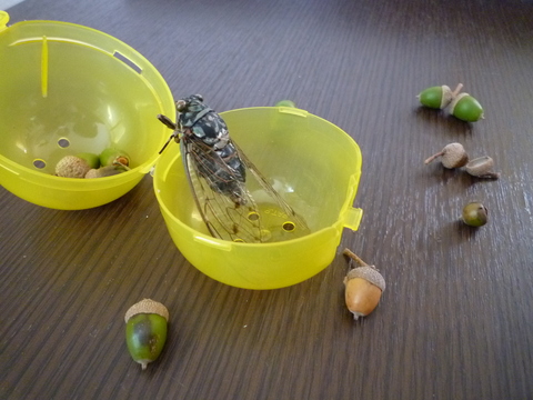 つみきの帰り道に収穫してきたモノモノたち。メインはなんといってもミンミンゼミ(死骸)。