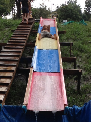 手作り感満載なウォータースライダー。水はホースで流してるんです。