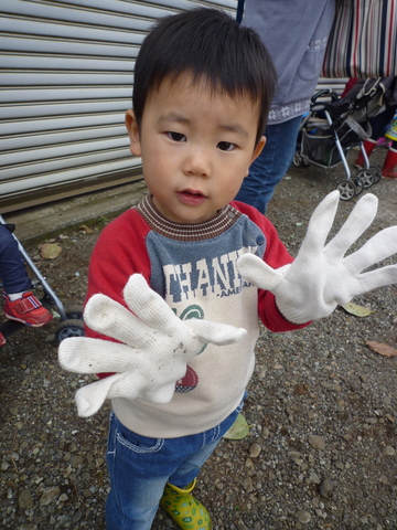 今日はつみきでサツマイモ掘り。軍手はちと大きいが、がんばってくれたまえよ。