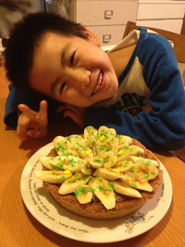 今日が本当のバースデー。何もないのもかわいそうなので、母さんから手作りチョコバナナタルトのプレゼント。