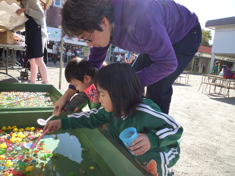 バザーの日は、幼稚園は縁日モード。まずはこれ!とやるき満々ですくっています。