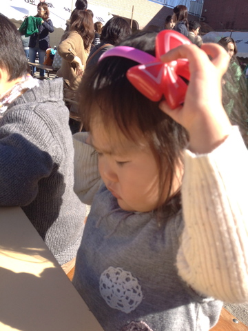 寿はひも引きでかわいいカチューシャをゲットしたのですが、つけるのイヤなんですって。