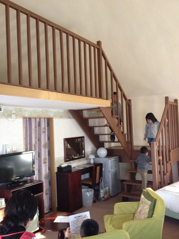 子供たち大興奮の階段。ロッジスタイルだと隣や階下に気を遣わずに遊ばせられてよいです。