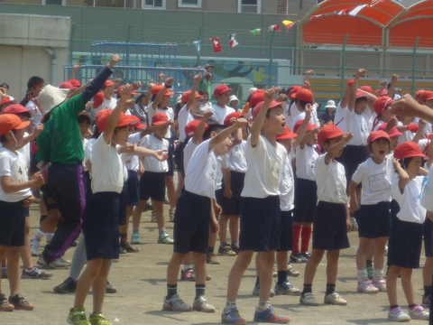 やるぜー!おー!とやってます。あれ?帽子?