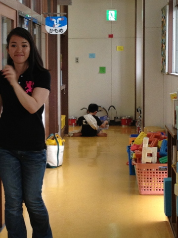 廊下の端で、スリングしたまま本読んでました。マイペース、マイペース。