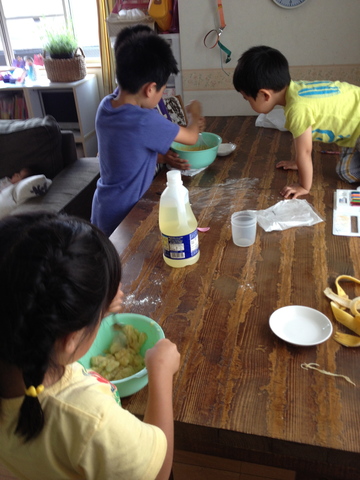 自分たちのお気に入り「チョコバナナケーキ」をお父さんに作ってあげるんだそうです。