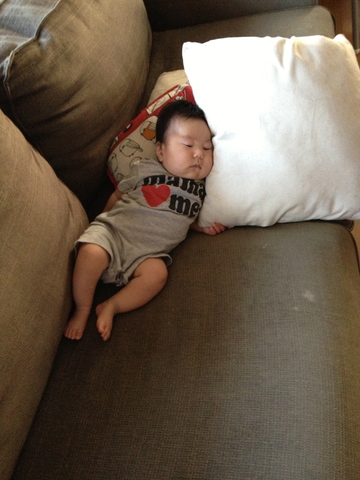 母さんの身代わりにクッションを預けられて寝ています。しっかり握りしめてるのがかわいい。