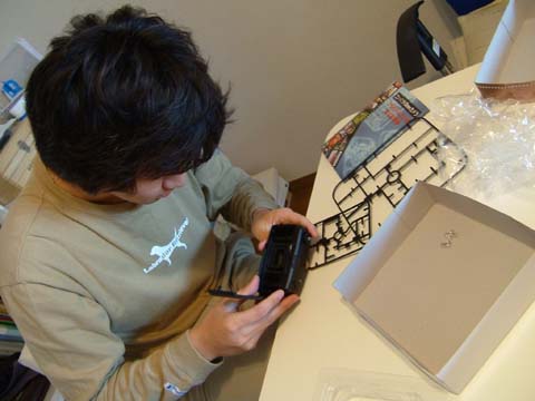ひとことも発せず、ゆうのおみやげのプラモデルカメラに夢中になっているいい大人。