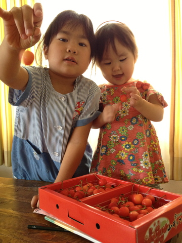 宮城からさくらんぼが届きました。大はしゃぎの子供たち。この後、みんなでおいしくいただきました♪