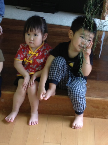 短冊を飾って、からの集合写真。おすまし寿にどこ見てるかわからん新さん。