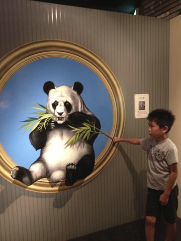 パンダに笹をあげる空。どの作品も立ち位置とカメラ位置などの指示が床にあって、それに従って撮ると立体的に見えるんです。