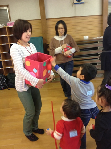 今日のつみきは運動会。玉入れは、カゴ役のお母さんが持った箱へ玉を入れます。