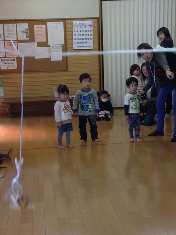 パン食い競走の要領で、つり下げたお菓子を取るレース。寿の付き添いは兄です。