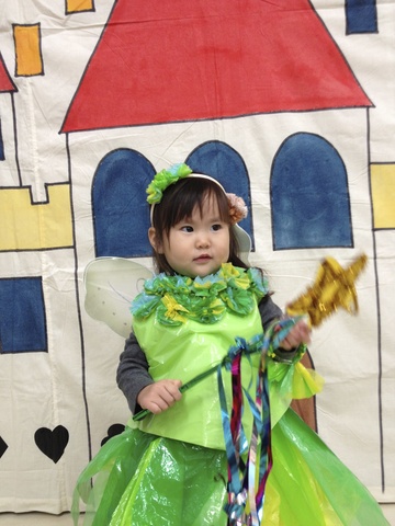 今日は幼稚園のバザー。毎年のお楽しみ、変身ドレスから。今年の寿はティンカーベル☆きらりん☆