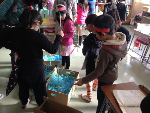 今日は小学校の学習発表イベント。凪は魚釣りを出店。ハチマキが凛々しいね。