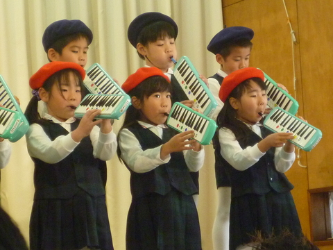 歌の前に前奏に合わせてメロディオンを。年長さんになるといろいろやるねぇ。