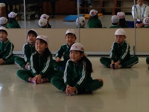体操の先生が来て行う週に一度の体操の時間。今日は年に一度の体操参観です。ニコニコで準備運動。