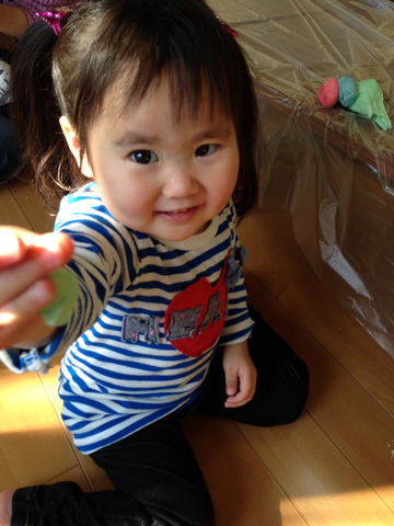 ねんどでーす。今日はつみきで小麦粉粘土やってまーす。