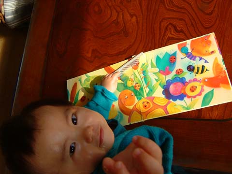 絵本でごまかされながら顔洗って保湿剤塗られたところ。