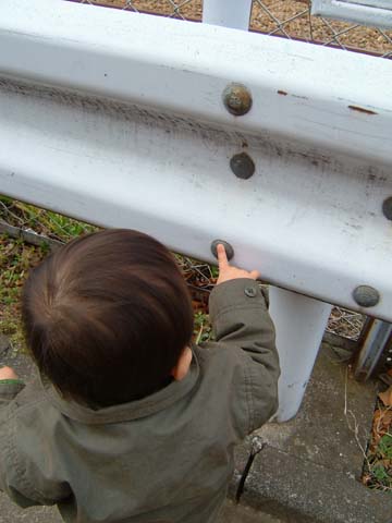 今日は散歩の間中、こうやってガードレールの留め金を押して回ってました。だんだん、自分の世界ができてきたね。