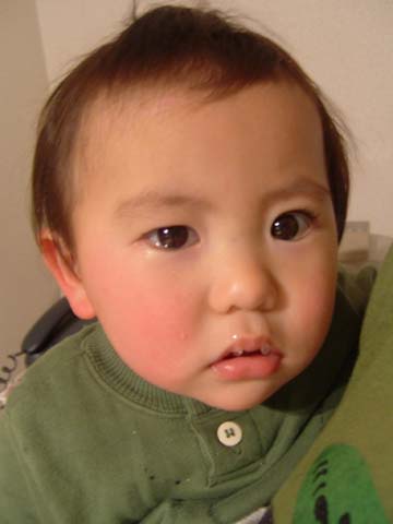 機嫌悪くお昼寝から起きて泣いたのでこの顔。鼻水なんて両方からたれてるし。