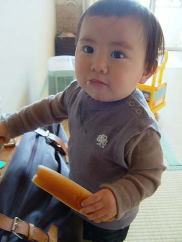 スティックパンをもぐもぐしながら、ゆうさんに借りた真吾の出張用カバンを物色中。