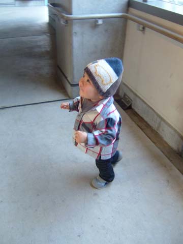 マンションの壁に色ガラスが入ってるのがきれいだねぇ、という顔。