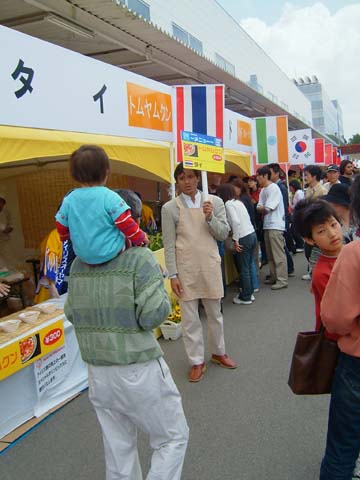 社員さんのお国料理を出す屋台がずらり!「トムヤムクン、サイコーよ」って売り込まれてるところ。