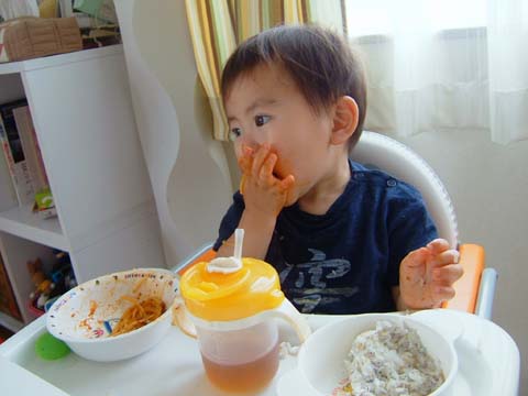 炭水化物大好きな空のランチはおにぎり&パスタ。こーゆーときは口の周りが汚れてもおかまいなし。