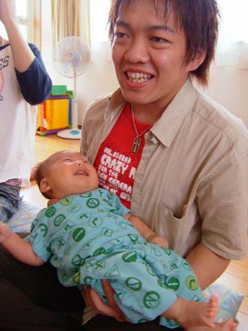 凪がむずがってるため微妙な笑顔です。ごめんねー、困ったよねぇ。
