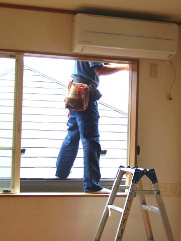 我が家にエアコンがきました。すごいところですごい体勢で取り付けてくださってます。