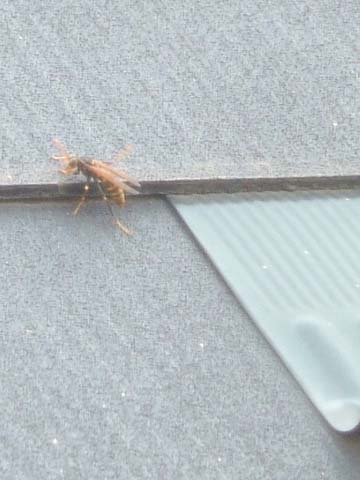 お隣の屋根にいるスズメバチ。最近、ここが気に入ったらしくて毎日フラフラやってくるのです。お願いだからお友達呼んだりおうち作ったりしないでよぉぉぉ!!