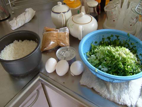 チャーハン作りまーす!我が家のポイントは青菜。2-3種類(この日はカブの葉と小松菜と葱)をどっさり入れます!