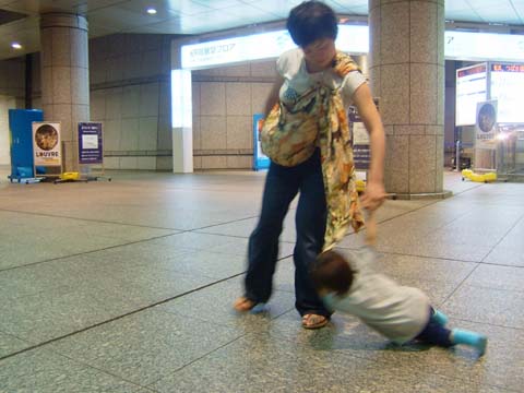 はしゃぎすぎて転びまくる空と必死に持ち上げようとするトモコ。凪はスリングで爆睡中。