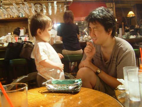原宿のラ・ボエムにきました。メインがなかなかこないので遊び始めた2人。