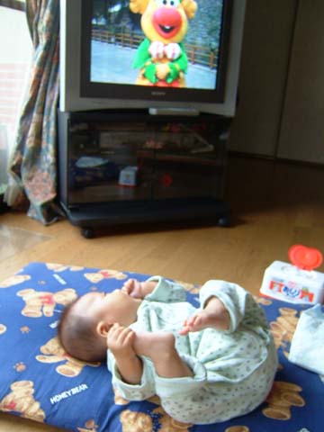 最近朝が早い凪(この日は4:50起床)。子供向けテレビの始まる時間になると、それぇっ!って感じでテレビに預けられます。