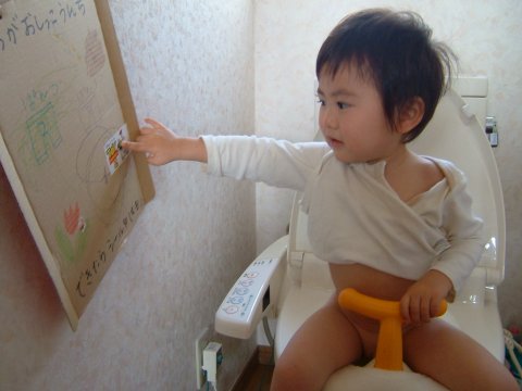 おしっこが成功する度に1個シールを貼ります。今んとこ、勝率2割。なかなか貼れないんだよね。