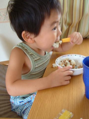 これ以上開かないくらい口開けて納豆をほおばってます。