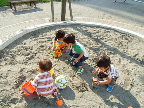 しばらくぶりに百木野家にきました。みんなで砂場で遊んでます。