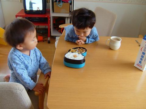 朝食前の2人に狙われる真吾の弁当。危うし!!!