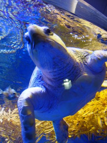 カメラ向ける人の方に泳いで行く事情のわかったカメ。