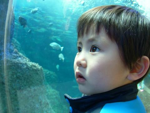壁面の鏡にも水槽の中が映ってるのを発見したところ。